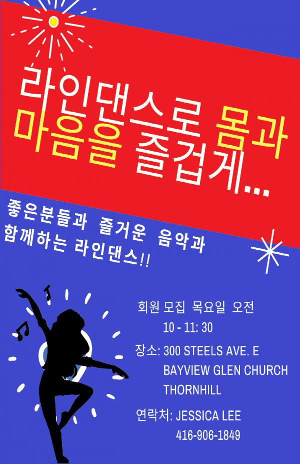 비기너 라인댄스 회원 모집 작성자 정보 뮤지 작성 작성일 2022.11.17 05:25 컨텐츠 정보 2,475 조회 목록 본문 안녕하세요. 추워지는 계절입니다. 좋은 음악과 함께 열정적으로 즐겁게 라인댄스에 빠져보세요. 누구나 쉽게 할수있는 라인댄스를 시작해보세요. 장소: 300 Bayview Ave. E. Bayview Glen Church 시간: 매주 목요일 10시 - 11시 30 분 회비: 달에 $60. Jessica Lee 416 906 1849 관련자료 이전 PGA of Canada Professional. 태권도 40년 지도 경 작성일 2022.11.18 09:03 다음 MTO 교통부 승인. 빠른 실기시험 예약, 합격률 100%(G2, G), 작성일 2022.11.15 08:58 댓글 0 등록된 댓글이 없습니다. 로그인한 회원만 댓글 등록이 가능합니다. 목록