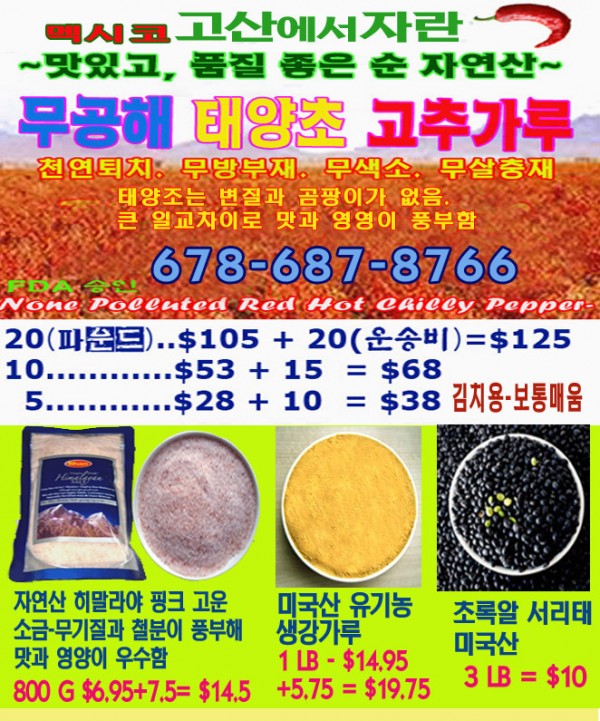 신선한 고추향과 맛 무공해 태양초 고추가루! 작성자 정보 riverflow 작성 작성일 2025.09.28 06:36 컨텐츠 정보 925 조회 목록 본문 신선한 고추향과 맛 무공해 태양초 고추가루! 관련자료 이전 비싼 나무 인당 한그루씩 드립니다. Woodbridge 지역. 좋은 나무 작성일 2025.09.30 13:31 다음 Imbera 영업용 원도어 유리쿨러(25x23x55`) $885. QBD 작성일 2025.09.26 13:33 댓글 0 등록된 댓글이 없습니다. 로그인한 회원만 댓글 등록이 가능합니다. 목록