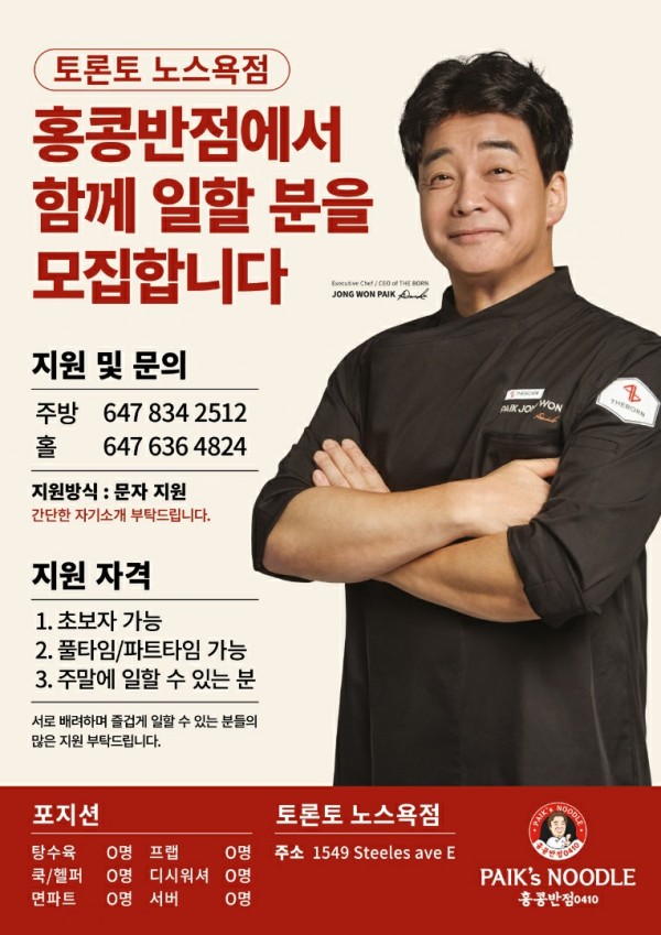 홍콩반점 노스욕 지점 구인 작성자 정보 뚜벅뚜벅뚝배기 작성 작성일 2023.03.31 15:13 컨텐츠 정보 2,520 조회 목록 본문 포지션: 탕수육, 면 파트, 쿡 헬퍼. 파트타임 가능. 주말 가능하신 분. 관련자료 이전 Genesis Markham에서 함께하실 Genesis Experienc 작성일 2023.04.04 08:58 다음 해외 선교에 동참하실 분. 중미와 남미에 단기 선교 같이 가실 분과 개신 작성일 2023.03.31 08:53 댓글 0 등록된 댓글이 없습니다. 로그인한 회원만 댓글 등록이 가능합니다. 목록