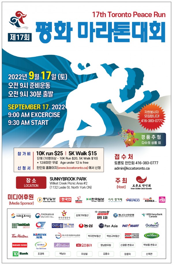 한인의 날 기념 제17회 평화 마라톤 대회 (Toronto Peace Run & Walk) 작성자 정보 관리자 작성 작성일 2022.08.26 04:10 컨텐츠 정보 992 조회 목록 본문 행사명: 한인의 날 기념 제17회 평화 마라톤 대회 (Toronto Peace Run & Walk)일 시: 2021년 9월 17일(토) 오전 9시 출발장 소: Sunnybrook Park: Picnic Area #2경기종목: 10km Run (달리기) & 5km Walk (걷기) 참가비: 10km Run 개인 $25/ 단체 $20 5km Walk 개인 $15/ 단체 $10 * 단체는 10인 이상이며, 만 12세 미만은 무료로 참여 가능주 최: 토론토 한인회●대회장: 김정희●준비위원장: 김재기 ●대회 총괄 본부장: 박진천 관련자료 링크 http://www.koreancentre.on.ca/ 231 회 연결 이전 [보도] 플레이어 챔피언쉽 컬링 대회 안내| Player's Championship Curling Tournament in Toronto 작성일 2023.04.10 14:44 다음 2022 제 2 회 한인 가을 축제 작성일 2022.08.19 00:39 댓글 0 등록된 댓글이 없습니다. 로그인한 회원만 댓글 등록이 가능합니다. 목록